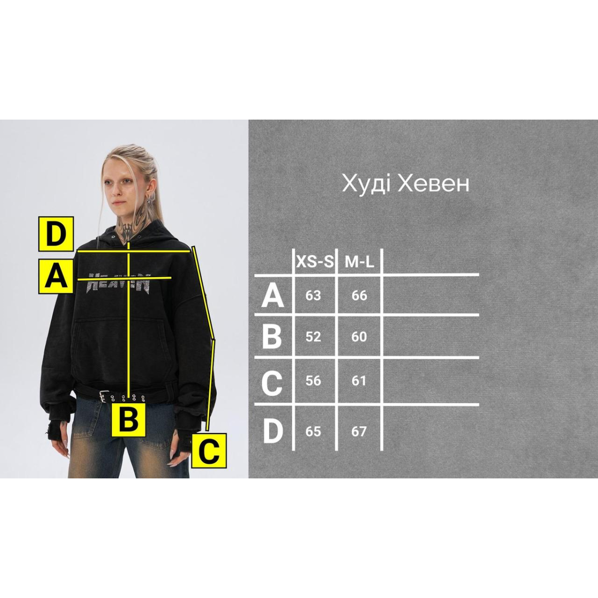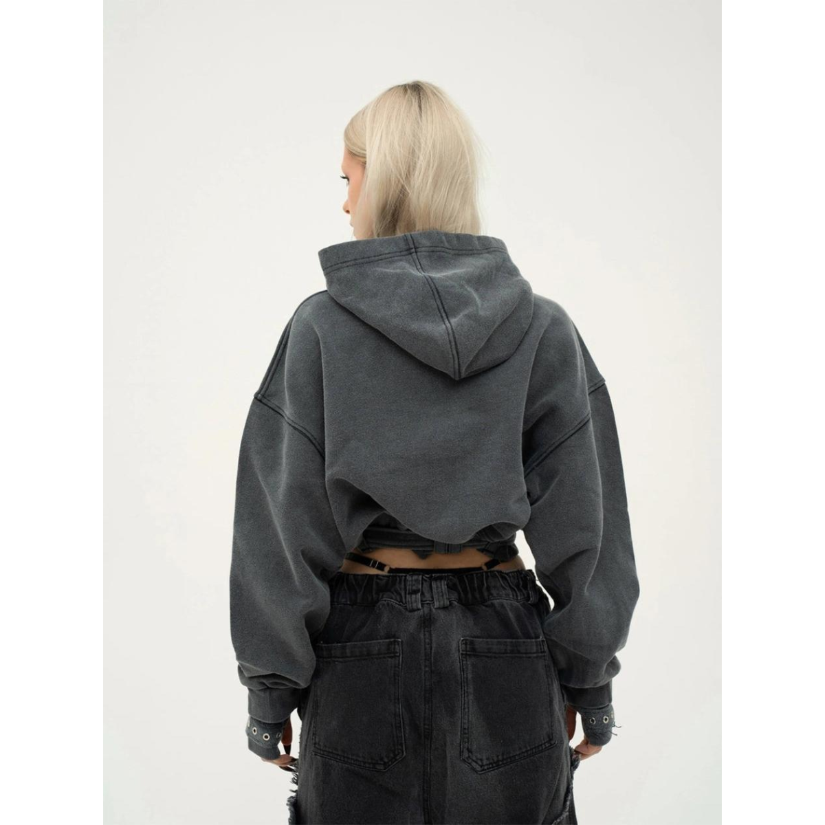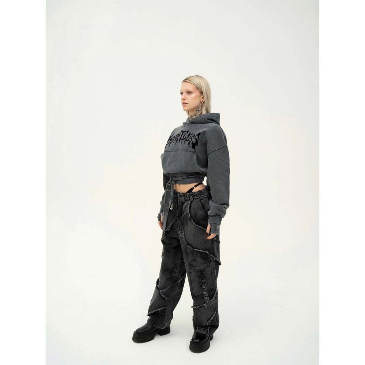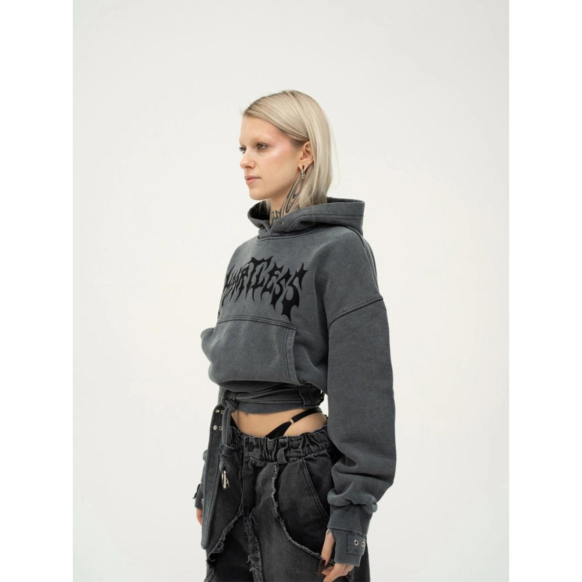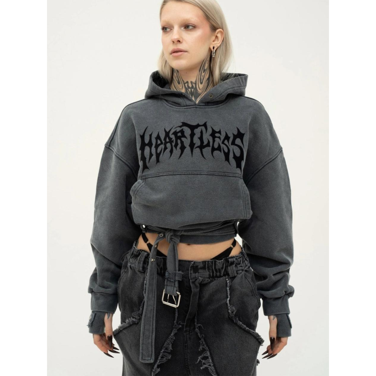 Худі з щільного котону об'ємного крою, виконане з використанням технології промислового прання для досягнення ефекту вицвілого кольору. Рукави з подвійними манжетами, а по низу виробу розташований пояс з металевою пряжкою. Худі прикрашене металевими люверсами та принтами з флоку з написом "Heartless".
