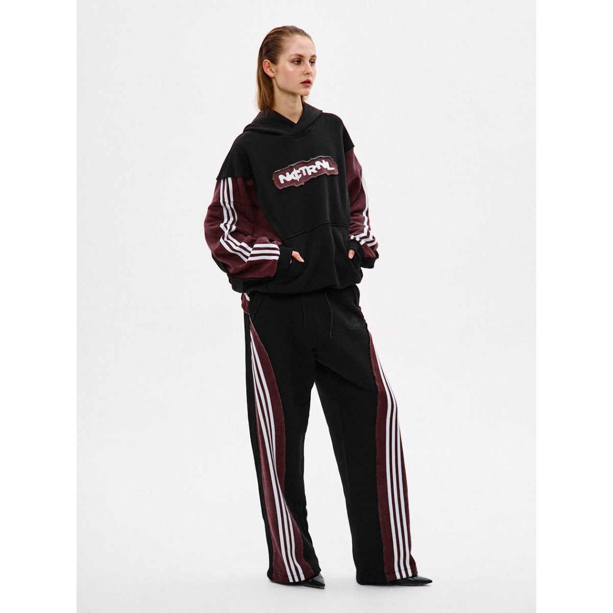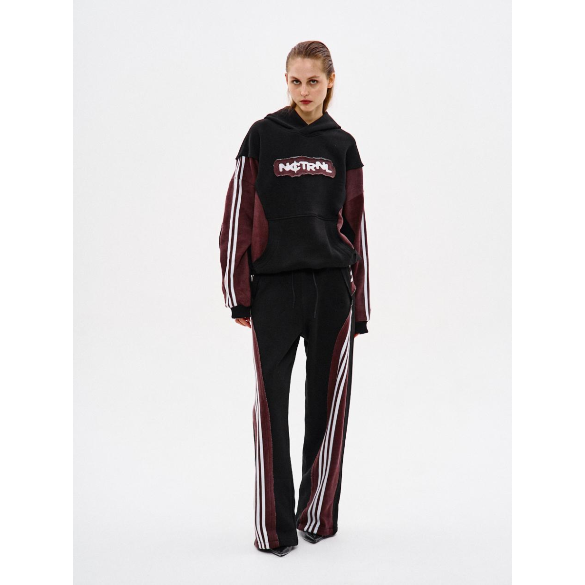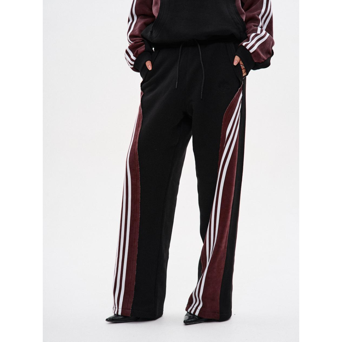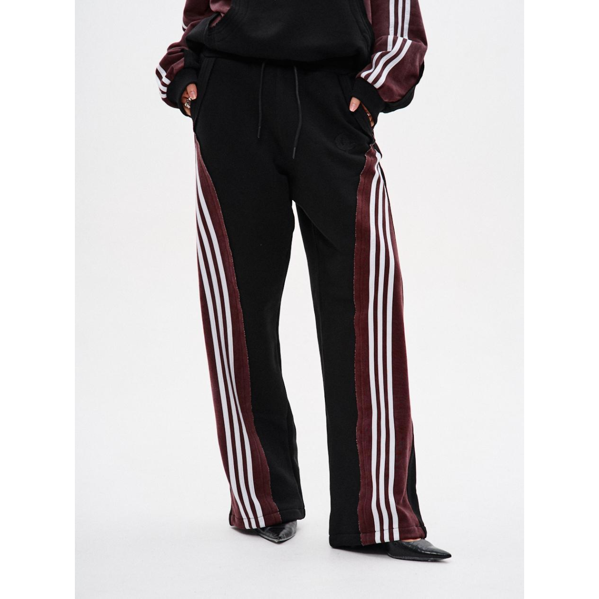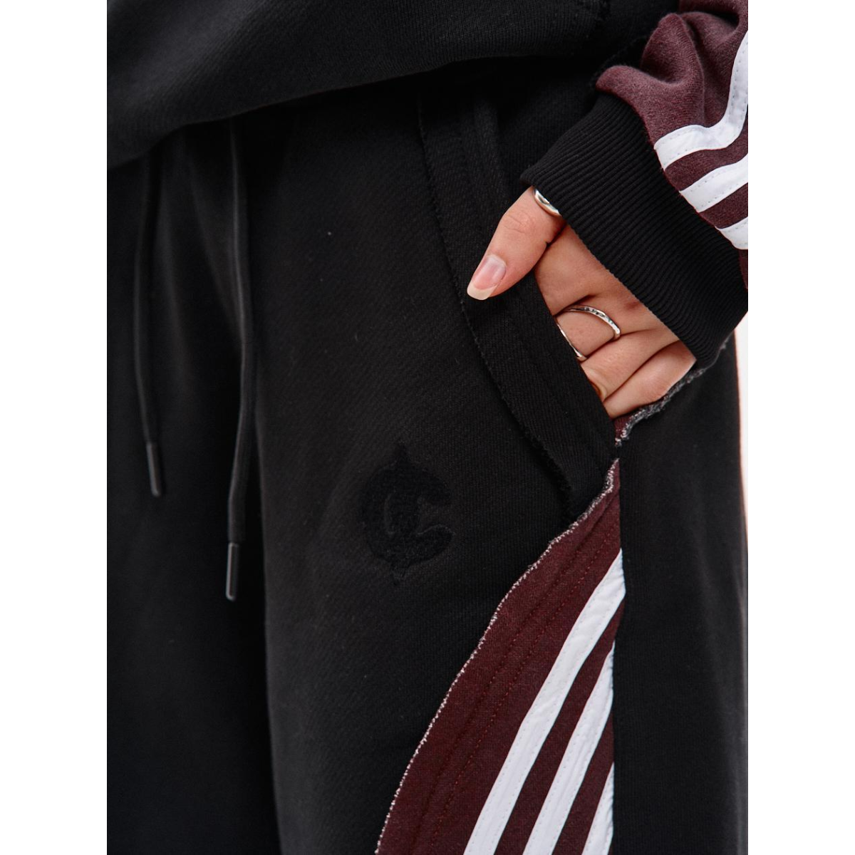 Підходить для речей, що потребують комфорту й витривалості у щоденному носінні. Ключові особливості моделі: Спортивні штани прямого крою з комбінації матеріалів у двох кольорах: основна частина — чорна, та кокетка ззаду — бордові з відкритими зрізами. На бордових деталях — по три білі лампаси з кожного боку.