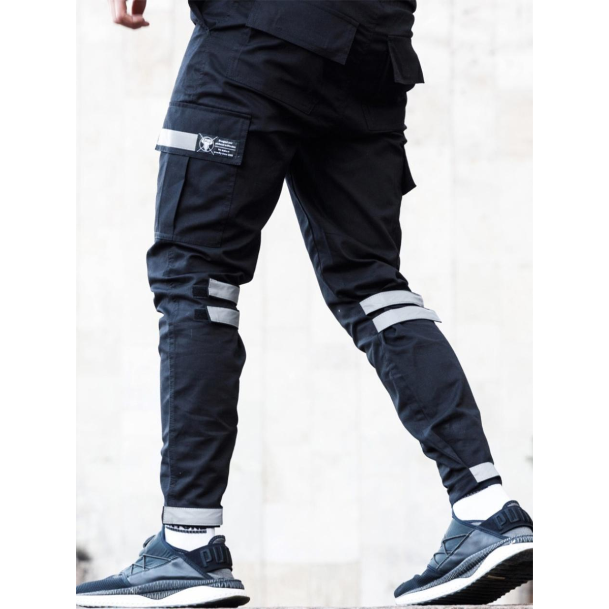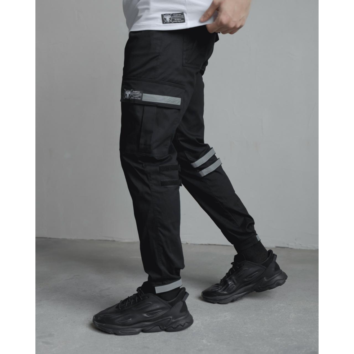 Штани класичного крою, звужені донизу — універсальний варіант для щоденного руху. Пояс на резинці зі шнурком забезпечує комфортну посадку. Ширина штанин регулюється в зоні колін і внизу за допомогою ліпучок з рефлективними вставками — естетика та функція в одному рішенні.